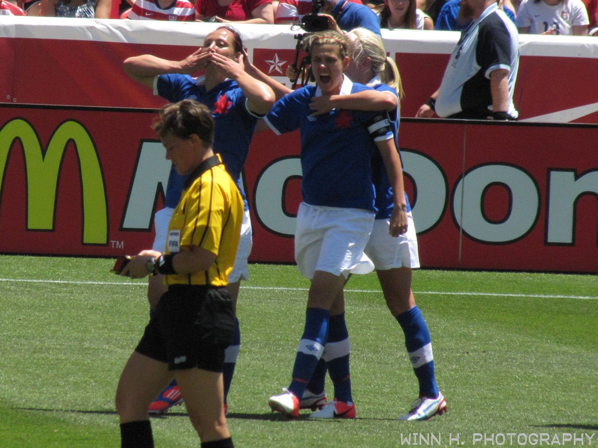 Melissa Tancredi blows a kiss to the Canadian-hating crowd as Christine Sinclair and an attached Kaylyn Kyle congratulate her. Tancredi actually planned all of this.